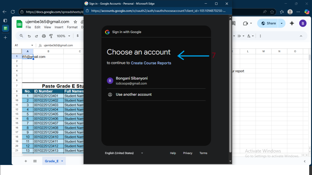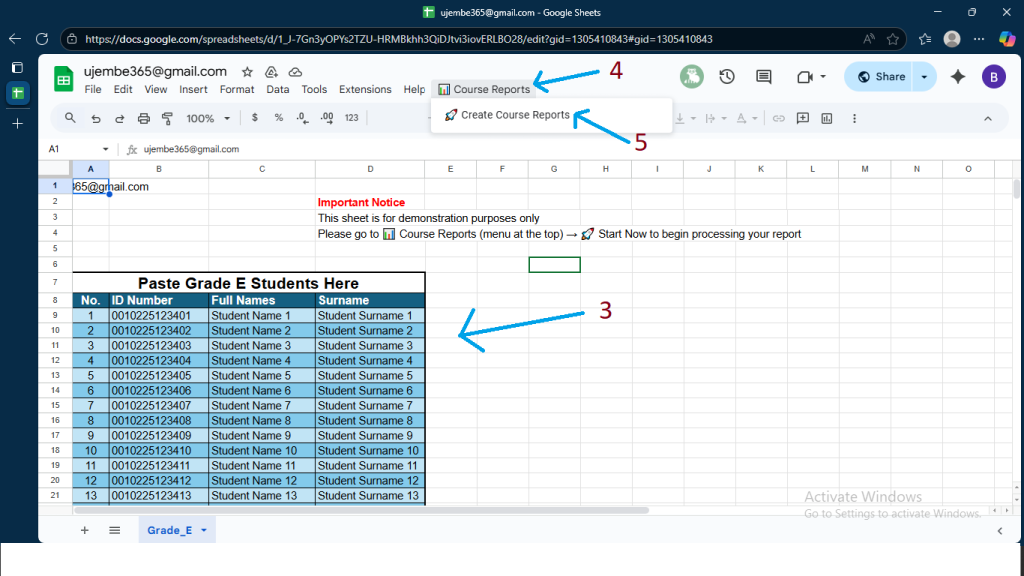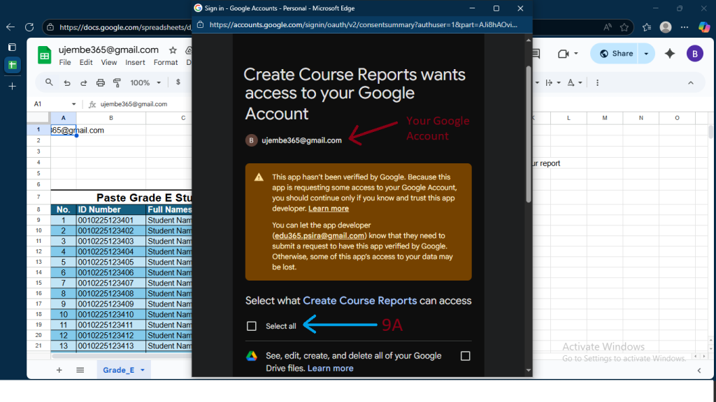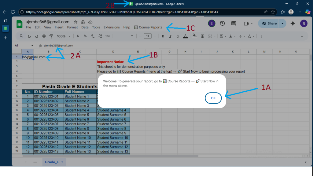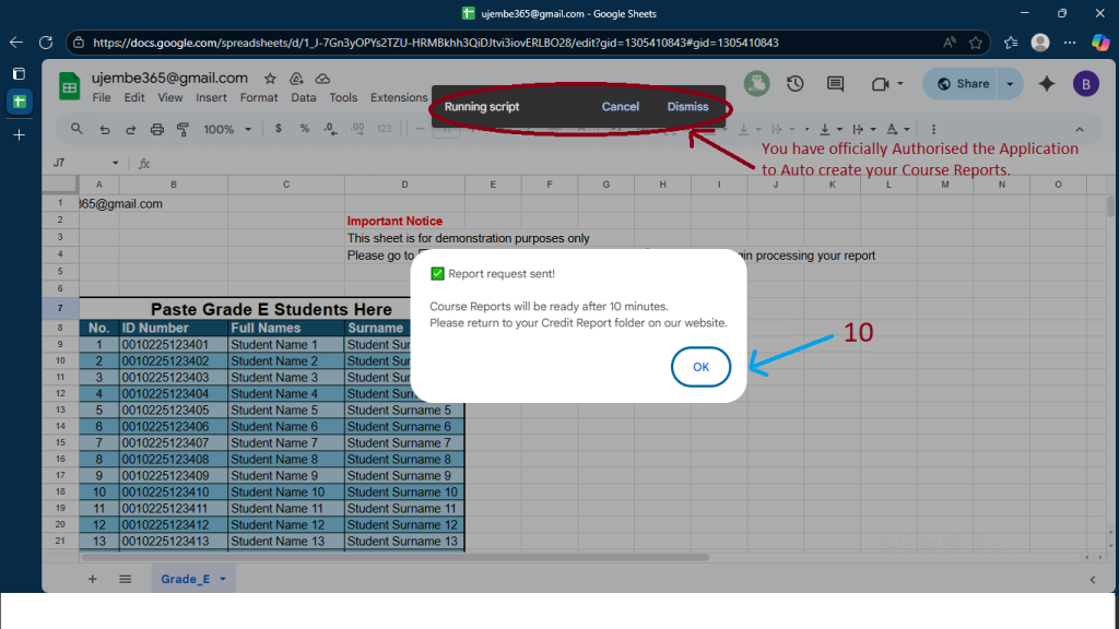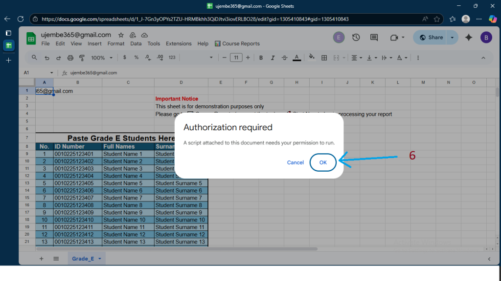 When you click on the “Create Course Reports” menu tab in the demo, a Google app script will run and ask you to authenticate it. This is a normal step required by Google to confirm that you are authorising the script to work with your account. While this may look technical or even a little intimidating, it is 100% safe, and done for demonstration purposes only.